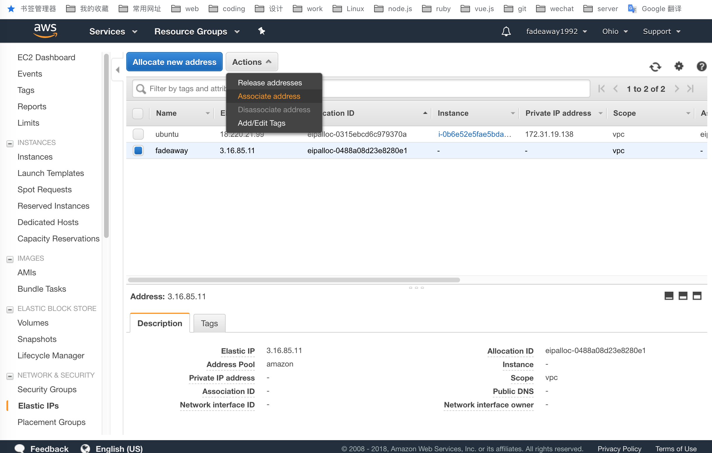 进入「Elastic IPs」页面,点击「Allocate new address」,申请一个新的静态IP地址。