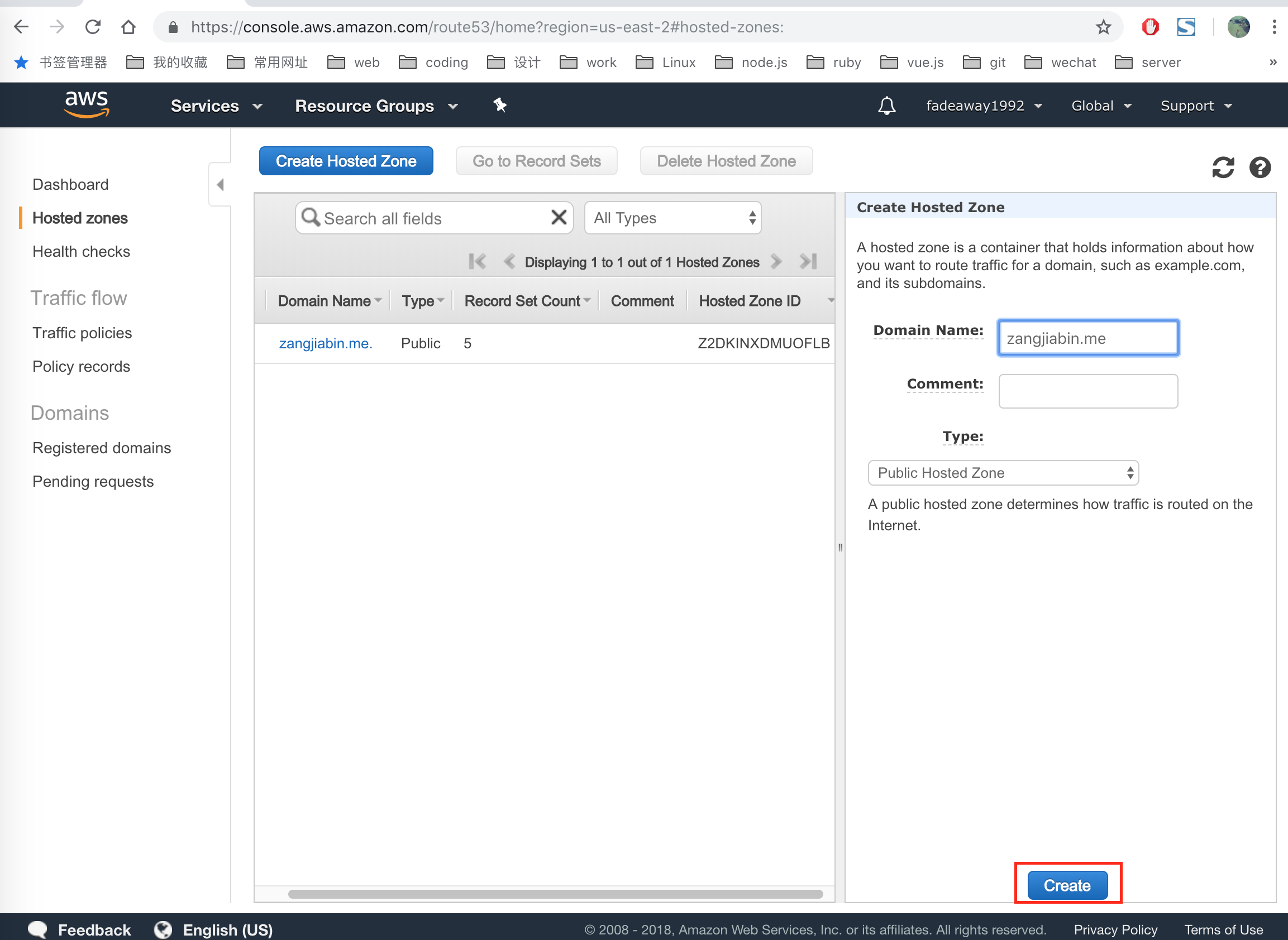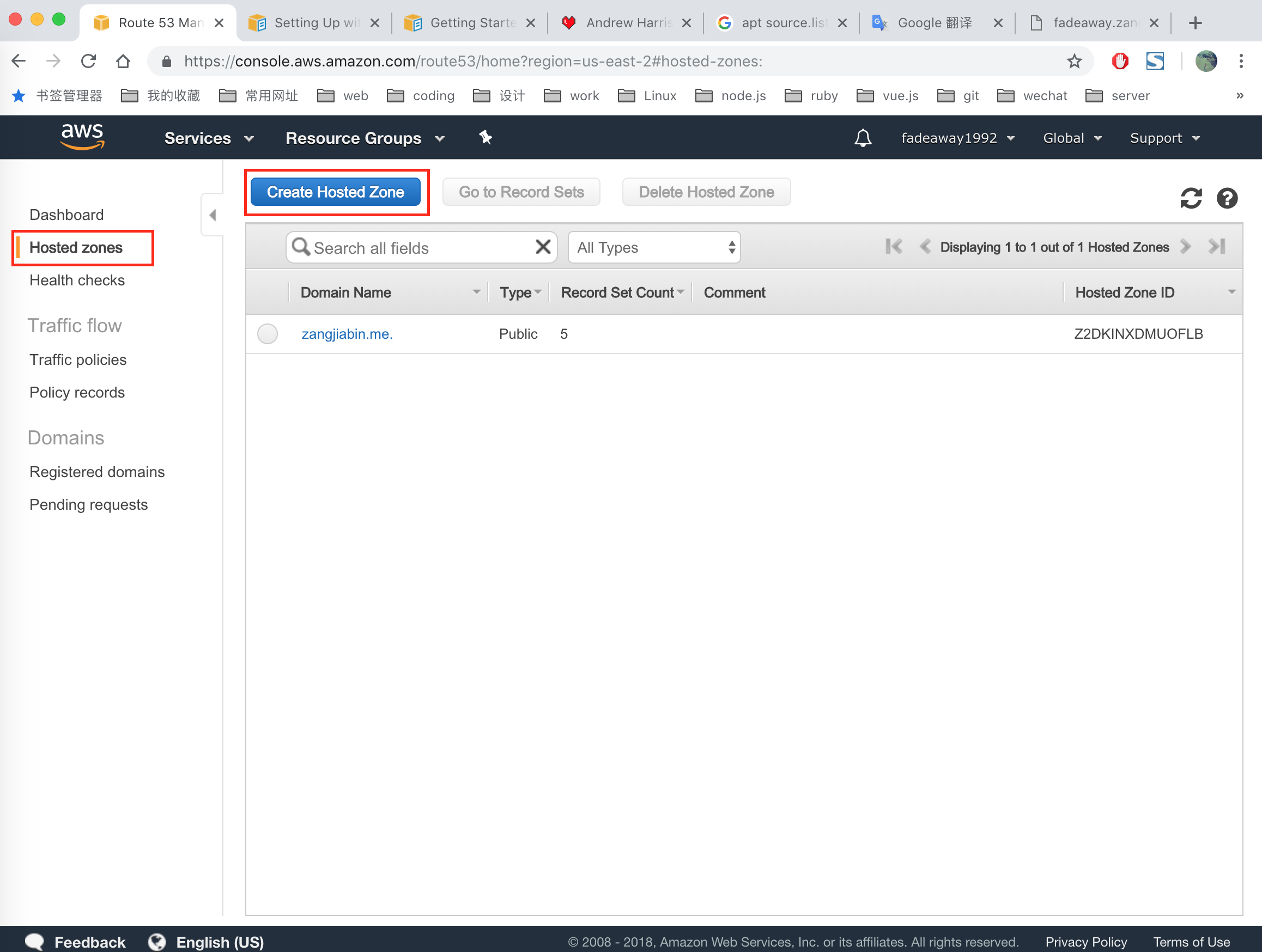 进入到 aws Route 53 控制台。选择 「Hosted zones」选项页