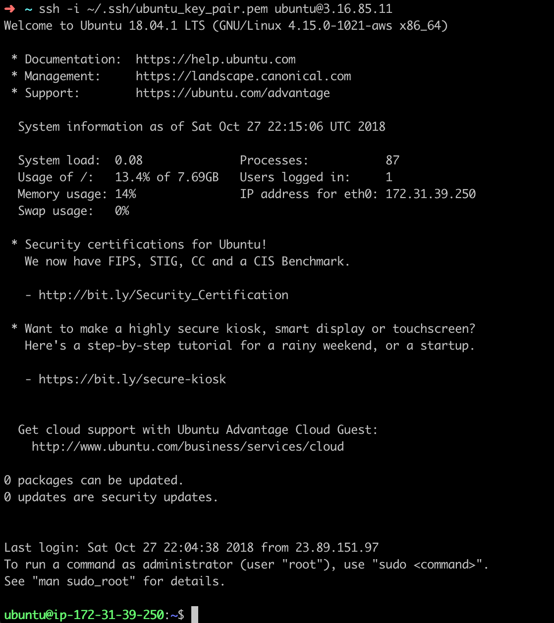 注意,上面的命令中,-i 后面跟的是你的主机秘钥的路径。最后的 ubuntu@3.16.85.11 中,3.16.856.11 是我们主机的静态 IP,ubuntu 是主机中的用户名。选择 ubuntu 系统作为主机模板的,默认是这个用户名。连接成功后如下图示