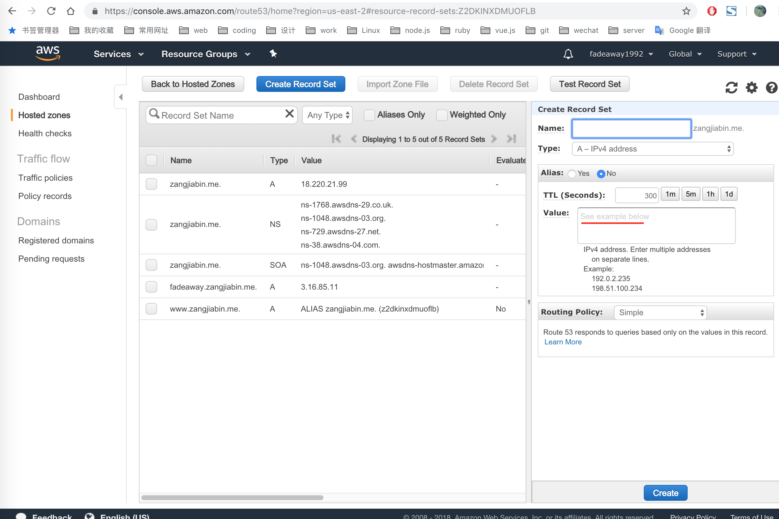 点击「Create Record Set」。Name 栏不填,Value 填上 IP 地址。点击「Create」。然后会创建出入上图左边第一条,即主域名对应的 IP 地址。仔细看第二条,即 Type 为 NS 的那一条,里面 Value 中的4个地址就是我们主域名的DNS服务器地址。当我们在浏览器中输入主域名时,DNS服务就会去里面4个服务器去查询域名对应的 IP 地址。