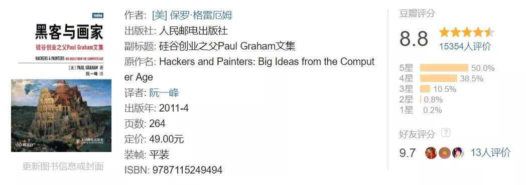 这本书的英文名为《Hackers and Painters》,出版于2004年,跟上期的《The Hitchhiker's Guide to the Galaxy》一样,出自O'Reilly出版社。中文名《黑客与画家》,出版于2011年4月,二版于2013年。