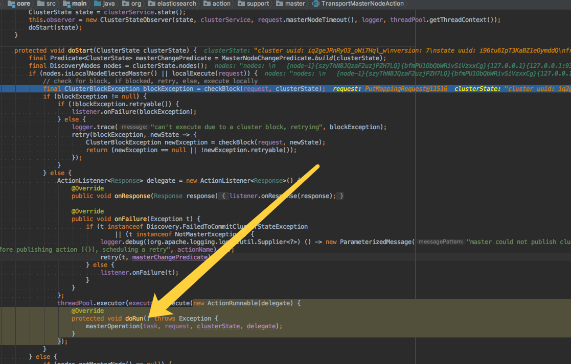 由于我是单节点运行的ElasticSearch,所以在实际执行任务的类是TransportMasterNodeAction,这个类是需要在主节点上执行的操作的基类。在该类的doStart方法中,通过类TransportPutMappingAction和参数task,reqeust最众到达实际的方法metaDataMappingService.putMapping中,如下图所示;