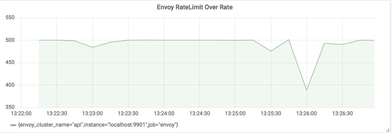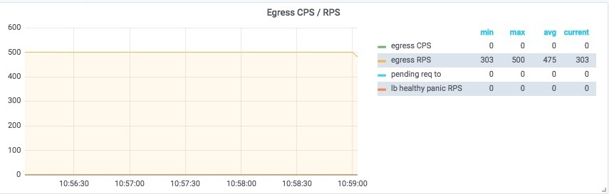 再查看一下 Envoy 传出的 API 连接,可以看到传出请求速率也在 500个请求/秒 上下波动!