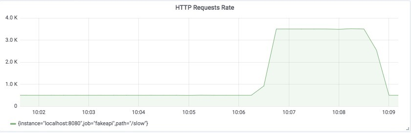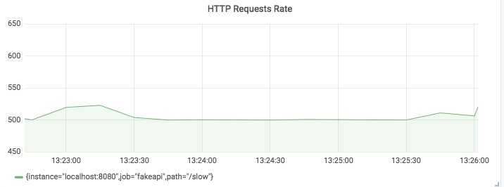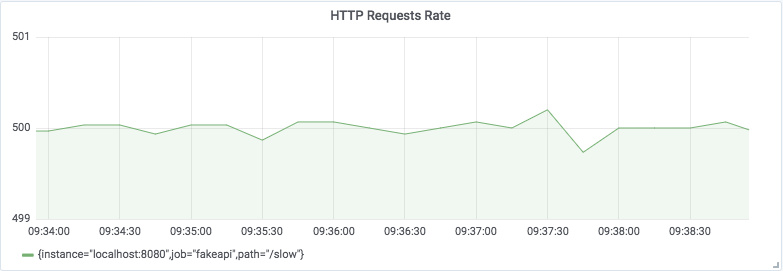 通过可视化 API 服务实际看到的请求数量,可以证明请求速率在 500个请求/秒 上下波动,这正是我们所期望的!