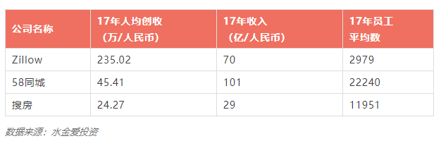 在房地产领域,美国房地产互联网领域的巨头 Zillow 员工人均创收远超过国内的58同城、搜房网。其中,Zillow 的员工创收能力是 58 同城的5倍,是搜房网的 10 倍。不过 58 同城的年收入要高于 Zillow,这说明要想提高人均创收水平,也许需要牺牲一下员工规模。