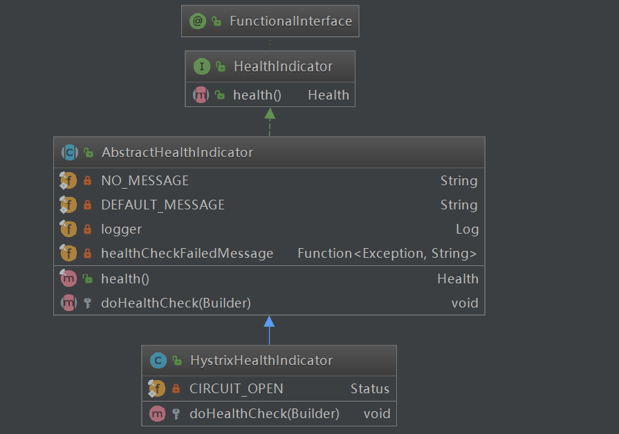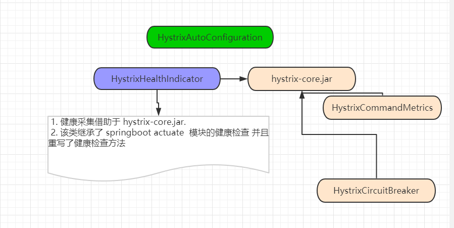 1.由图可知HystrixHealthIndicator 重写了actuator包模块的健康检查。会将熔断器开关打开了的熔断器添加到actuator的Builder中
