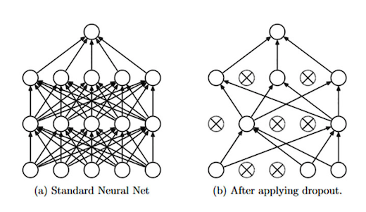 是不是感觉清晰了很多。左边是没有 Dropout 的网络,神经元之间都是全量链接的。右边是有 Dropout 的网络,可以看到在一次训练中,有一部分神经元是断开链接的,即失效了。每次断开链接的神经元都是随机了,这就给网络增加了很多可能,就像是具有了变异的能力。