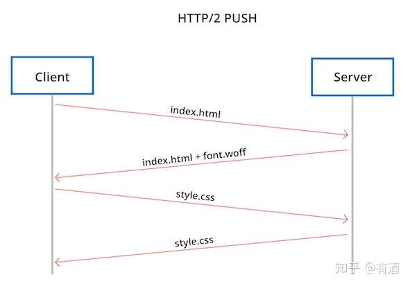 若使用 HTTP/2 PUSH,当服务端获取到 HTML 文件后,知道以后客户端会需要字体文件,它就立即主动地推送这个文件给客户端,如下图: