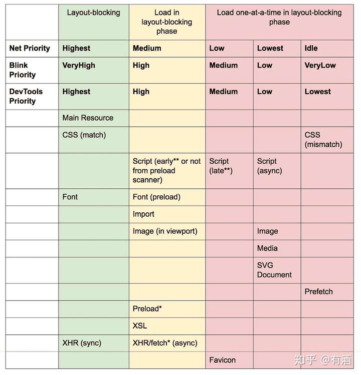 而 script 脚本资源就比较特殊,优先级不一,脚本根据它们在文件中的位置是否异步、延迟或阻塞获得不同的优先级: