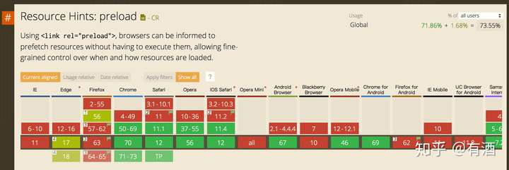 讲完 preload 的用法再来看下它的浏览器兼容性,根据 caniuse.com 上的介绍:IE 和 Firefox 都是不支持的,兼容性覆盖面达到 73%。