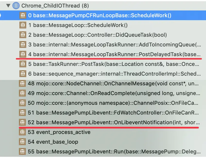通过打断点观察页面进程,推测应该是通过页面进程的子IO线程的libevent唤醒,最后调用PostTask给消息循环的task_runner: