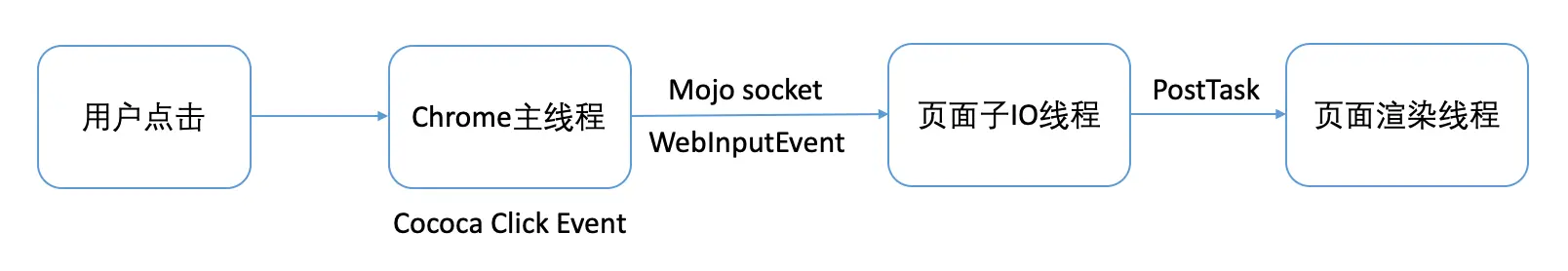 当我们在页面触发鼠标事件的时候,这个时候是浏览器的进程先收到了,然后再通过Chrome的Mojo多进程通信库传递给页面进程,如下图所示,通过Mojo把消息forward给其它进程: