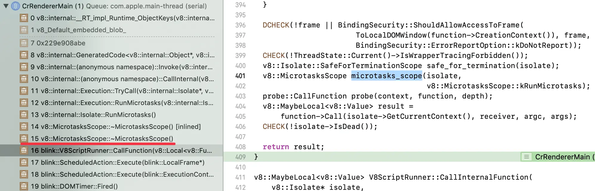 }这段代码先实例化一个scope对象,是放在栈上的,然后调function.call,这个function.call就是当前要执行的JS代码,等到JS执行完了,离开作用域,这个时候栈对象就会被解构,然后在解构函数里面执行microtask。注意C++除了构造函数之外还有解构函数,解构函数是对象被销毁时执行的,因为C++没有自动垃圾回收,需要有个解构函数让你自己去释放new出来的内存。