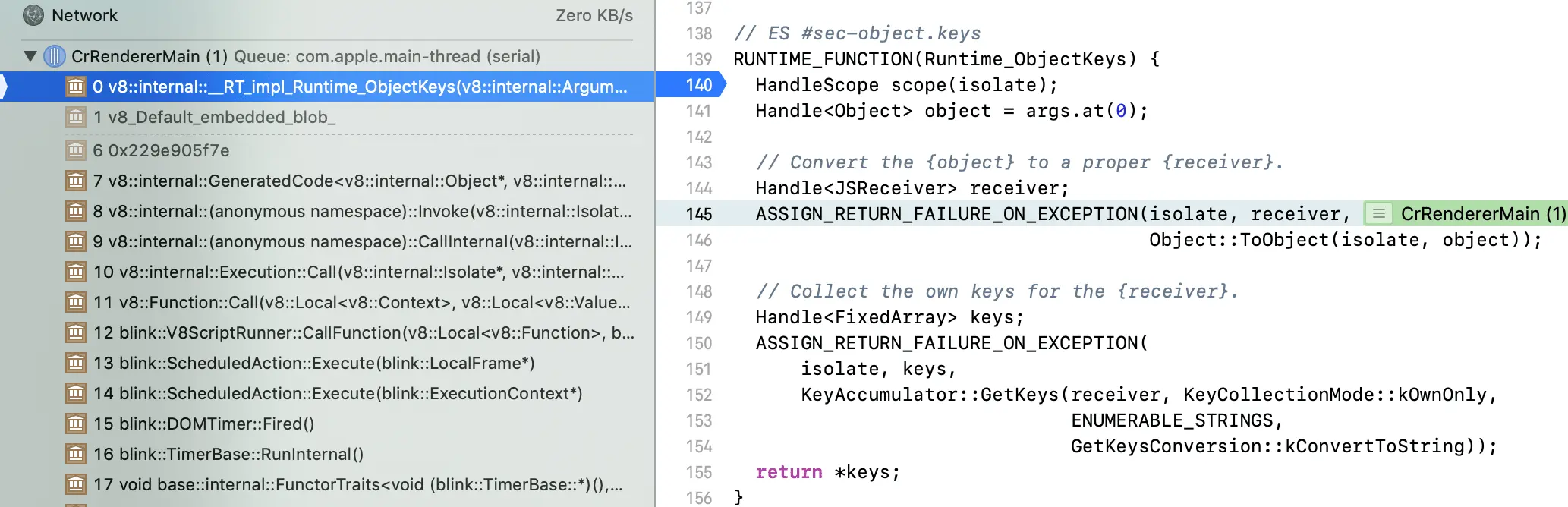 }, 2000);然后在v8/src/runtime/runtime_object.cc这个文件的Runtime_ObjectKeys函数打个断点,就能观察setTimeout的执行时机,如下图所示,这个函数就是执行Object.keys的地方: