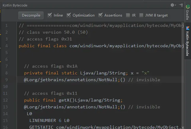 我们通过Tools->Kotlin->Show Kotlin bytecode打开Kotlin字节码界面,查看Kotlin文件的字节码形式。界面如下: