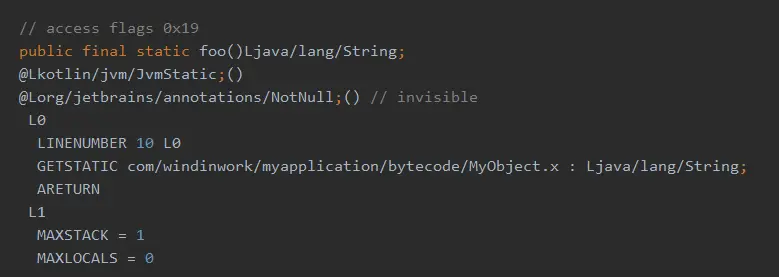 我们来分析一下这段字节码,可以看到,我们在Companion Object中声明的变量x,编译之后是作为MyClass的静态变量存在,而方法getX()和foo()是作为MyClass$Companion的成员方法存在。我们可以看到,MyClass通过一个静态变量Companion持有MyClass$Companion的引用,所以我们在访问x变量和调用foo()方法时,实质上是通过对Companion这一静态变量进行方法调用,于是我们在Java中对Companion Object单例的调用是这样的