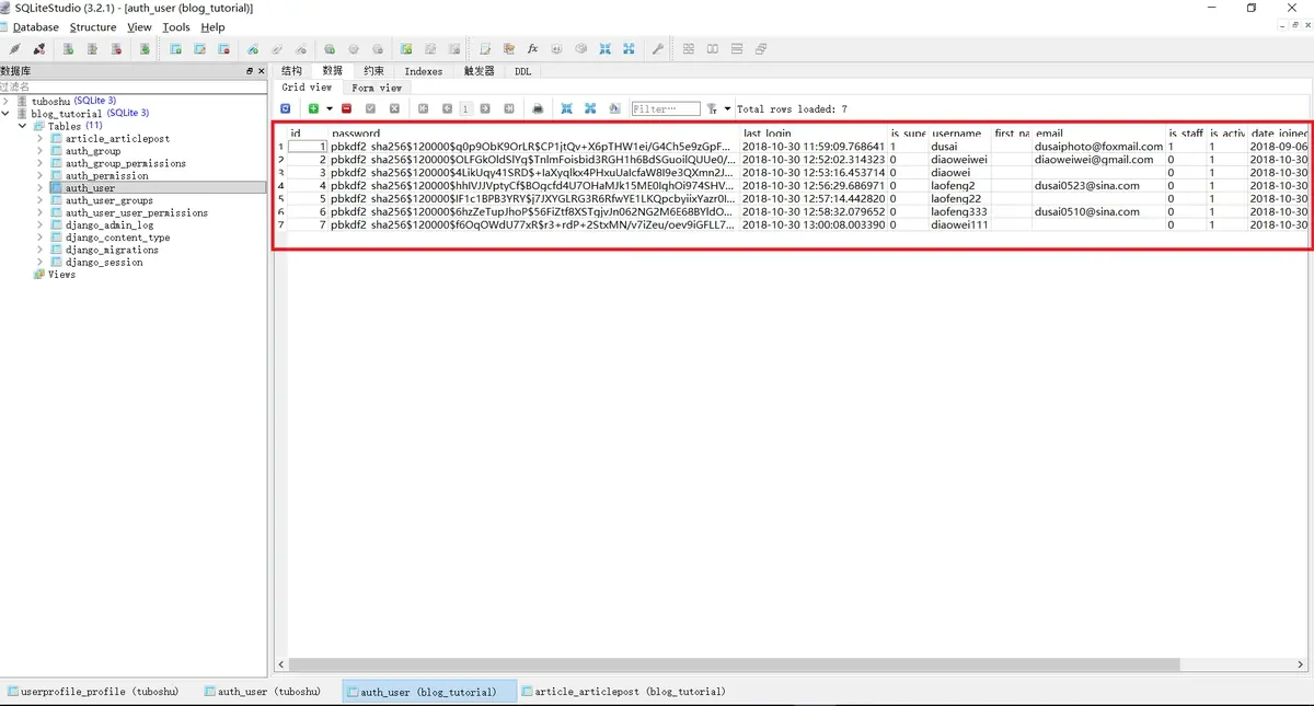 用SQLiteStudio打开项目中db.sqlite3文件,找到auth_user字段,显示如下: