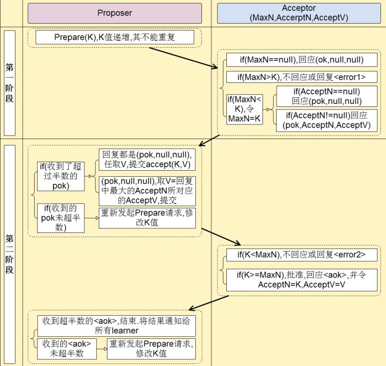c)Proposer没有收到过半Acceptor发来的回复,则修改议案编号K为K+1,并将编号重新发送给Acceptors(重复Prepare阶段的过程)