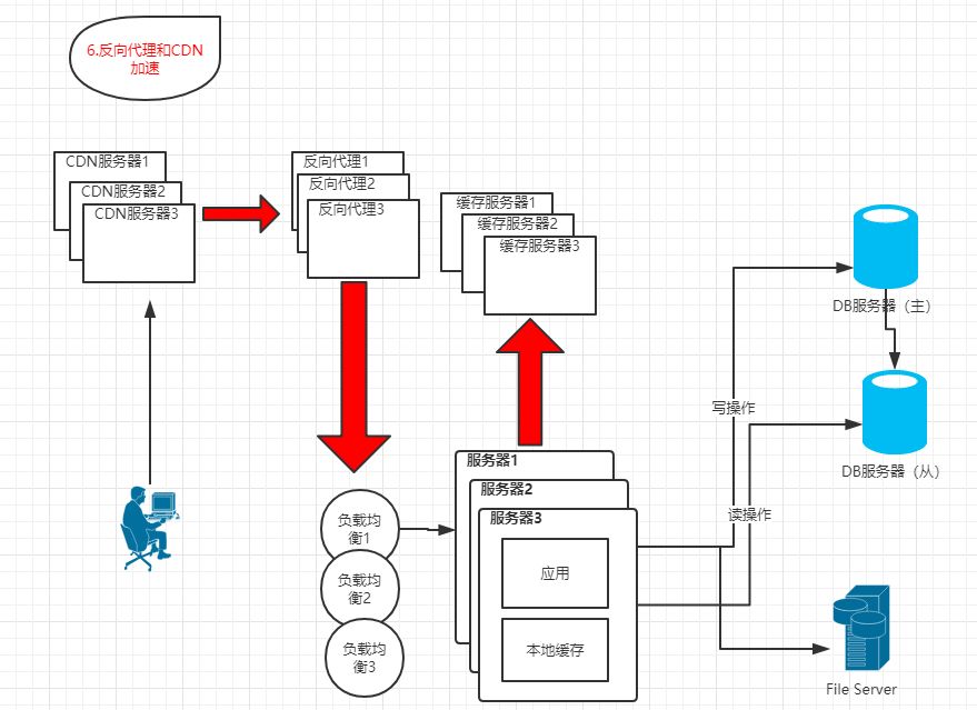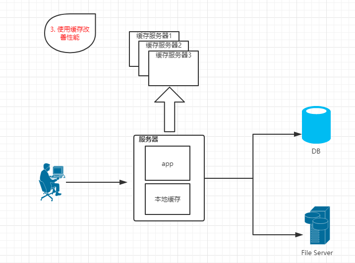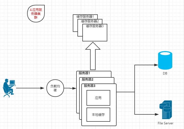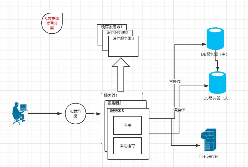 特点:App、DB、FileServer分别部署在独立服务器上。并且访问请求量较少