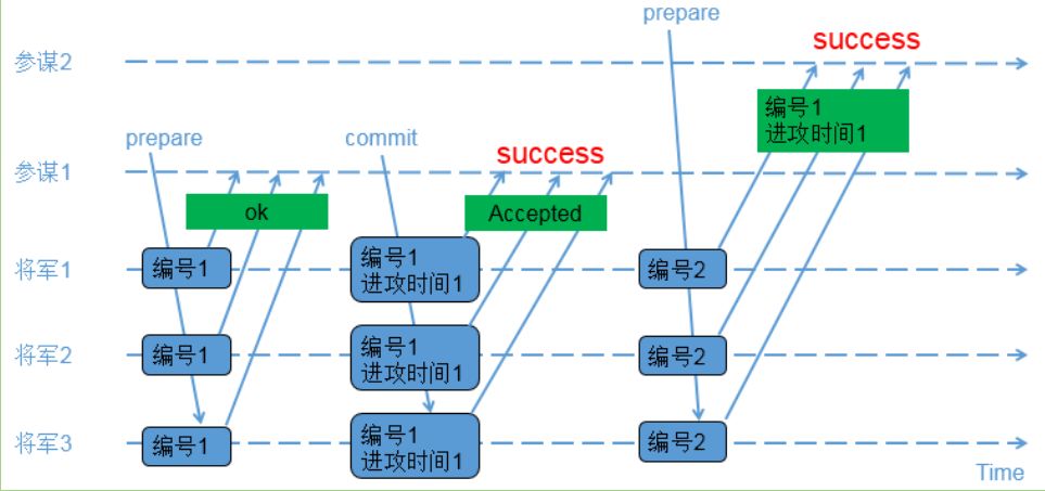 1)参谋1发起提议,派通信兵带信给3个将军,内容为(编号1);2)3个将军收到参谋1的提议,由于之前还没有保存任何编号,因此把(编号1)保存下来,避免遗忘;同时让通信兵带信回去,内容为(ok);3)参谋1收到至少2个将军的回复,再次派通信兵带信给3个将军,内容为(编号1,进攻时间1);4)3个将军收到参谋1的时间,把(编号1,进攻时间1)保存下来,避免遗忘;同时让通信兵带信回去,内容为(Accepted);5)参谋1收到至少2个将军的(Accepted)内容,确认进攻时间已经被大家接收;6)参谋2发起提议,派通信兵带信给3个将军,内容为(编号2);7)3个将军收到参谋2的提议,由于(编号2)比(编号1)大,因此把(编号2)保存下来,避免遗忘;又由于之前已经接受参谋1的提议,因此让通信兵带信回去,内容为(编 号1,进攻时间1);8)参谋2收到至少2个将军的回复,由于回复中带来了已接受的参谋1的提议内容,参谋2因此不再提出新的进攻时间,接受参谋1提出的时间;