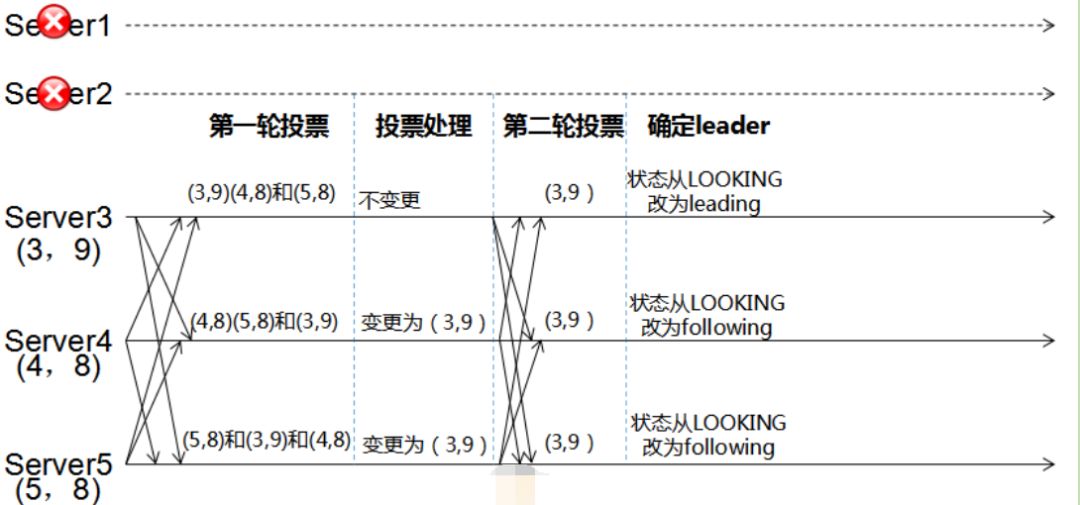 a.每个server都有一张选票<myid,zxid>,如(3,9),选票投自己。b.每个server投完自己后,再分别投给其他还可用的服务器。如把Server3的(3,9)分别投给Server4和Server5,一次类推c.比较投票,比较逻辑:优先比较Zxid,Zxid相同时才比较myid。比较Zxid时,大的做leader;比较myid时,小的做leaderd.改变服务器状态(崩溃恢复->数据同步,或者崩溃恢复->消息广播)