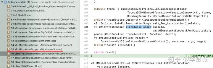 }这段代码先实例化一个scope对象,是放在栈上的,然后调function.call,这个function.call就是当前要执行的JS代码,等到JS执行完了,离开作用域,这个时候栈对象就会被解构,然后在解构函数里面执行microtask。注意C++除了构造函数之外还有解构函数,解构函数是对象被销毁时执行的,因为C++没有自动垃圾回收,需要有个解构函数让你自己去释放new出来的内存。