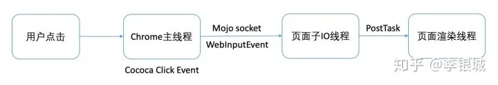 当我们在页面触发鼠标事件的时候,这个时候是浏览器的进程先收到了,然后再通过Chrome的Mojo多进程通信库传递给页面进程,如下图所示,通过Mojo把消息forward给其它进程: