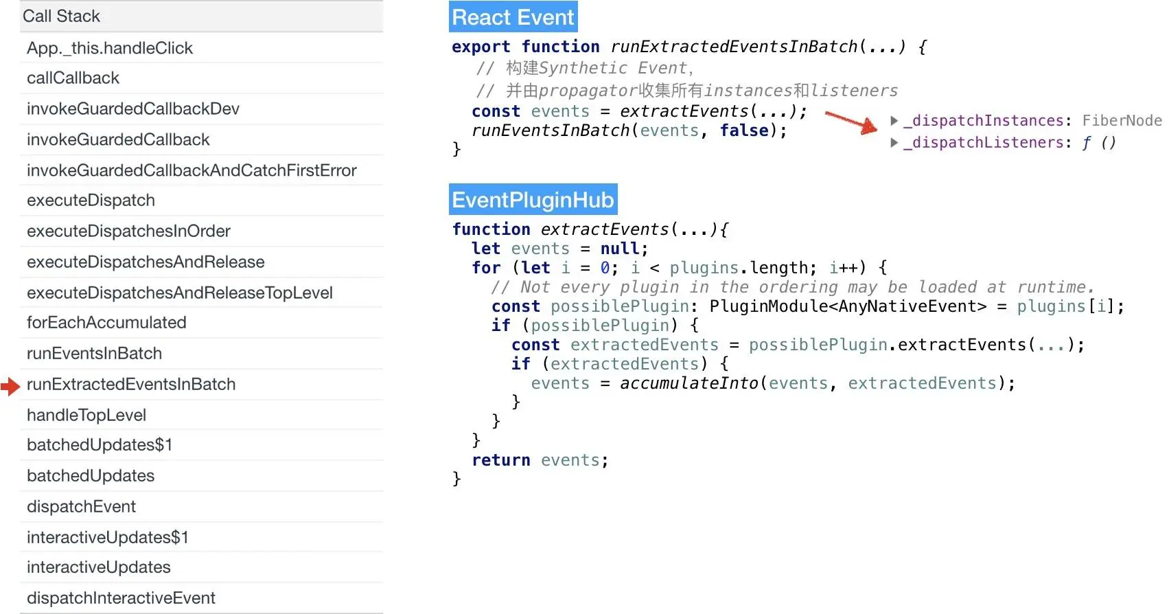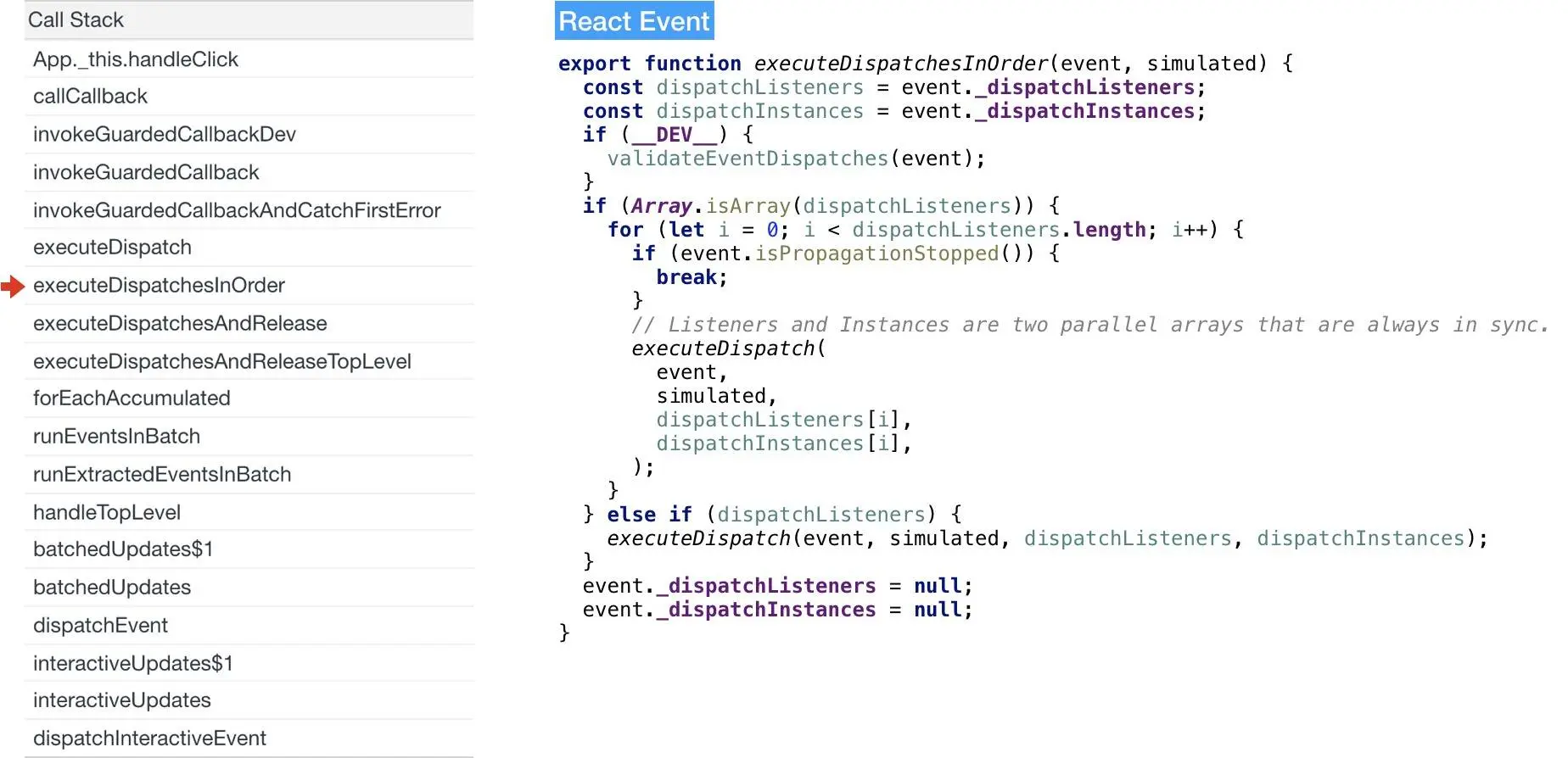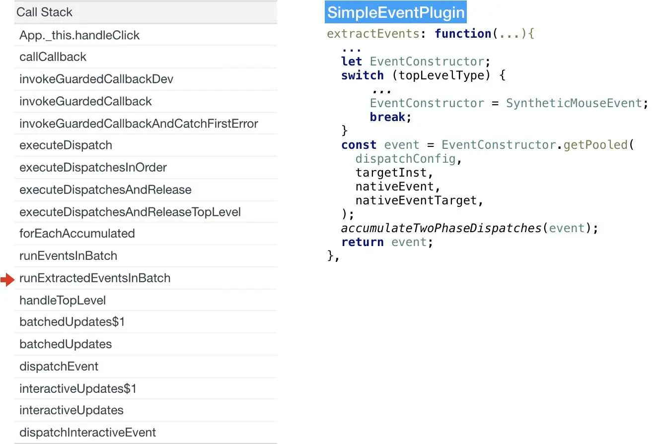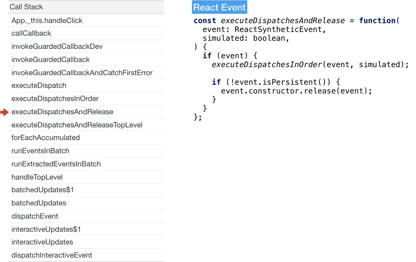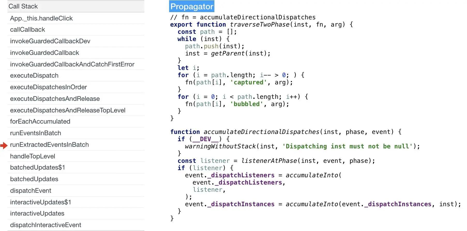 的按钮后的js调用栈,右边是每一步的代码,均已删除部分不影响理解的代码。希望通过这种方式能使大家更易理解React的事件触发机制。