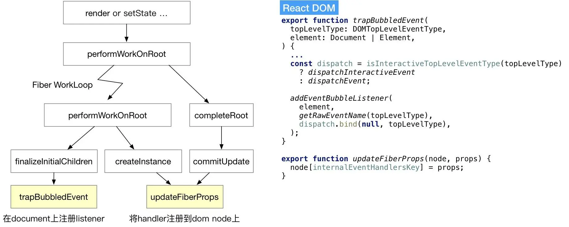 至此,我们我们已经在document上监听了事件,并且将handler存在对应DOM结点。接下来需要看React怎么监听并处理浏览器的原生事件,最终触发对应的handler了。