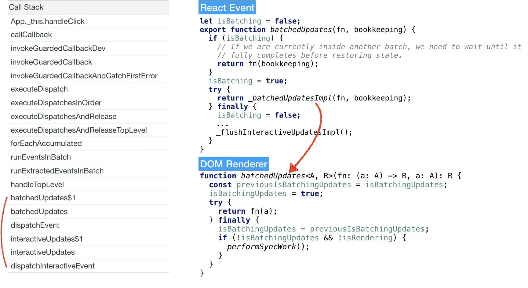 等不会被更新到DOM上。直到调用栈重新回到第一次调用batchedUpdates