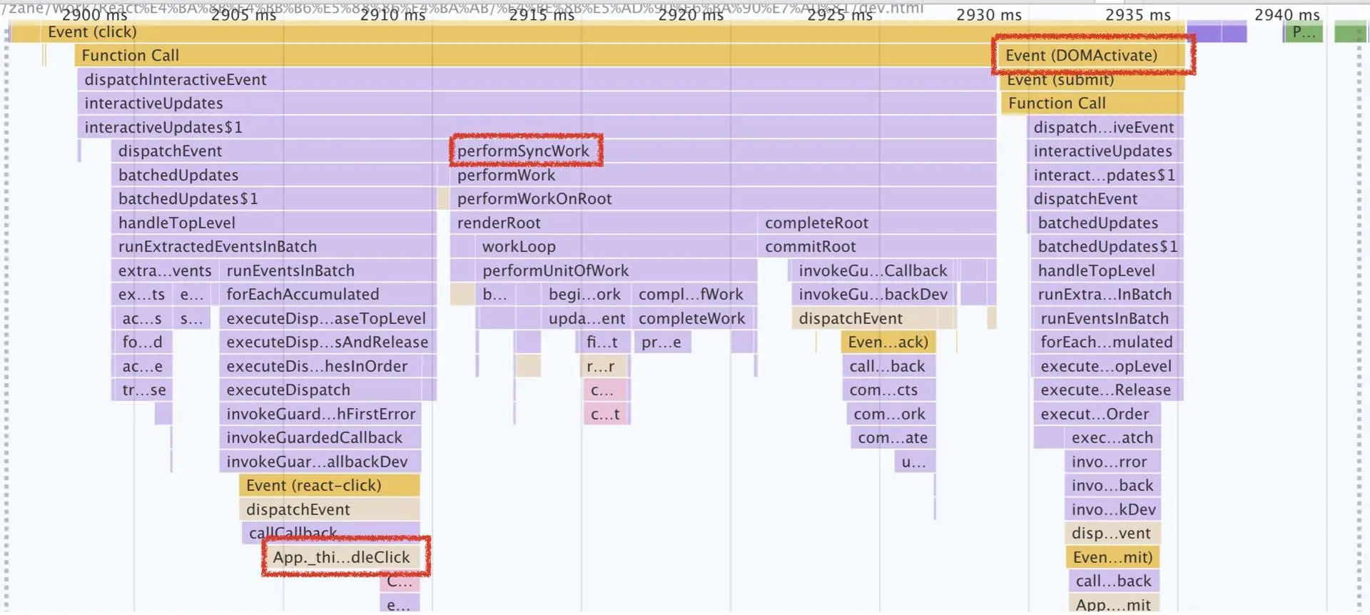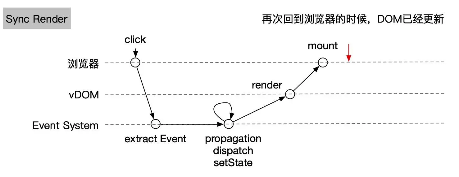 ,此时React事件系统对事件的处理执行完毕。由于目前React是同步渲染的,所以接着React执行performSyncWork