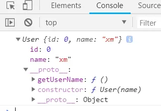 上面的代码中,User是一个函数,user是通过对User函数使用new操作符创建出来的对象,并且能直接调用定义在User函数原型中的方法。可以把这个user打印出来看一下