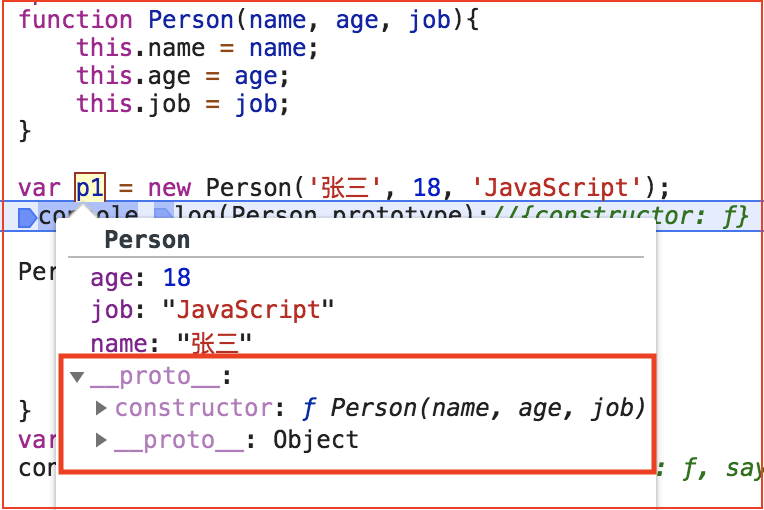 我们知道,通过new关键字创建一个对象,这个对象会有一个属性__proto__指向相应函数的原型,这里代码中的p1正是指向了这个原型,在Chrome的开发工具中可以看到,如下图所示: