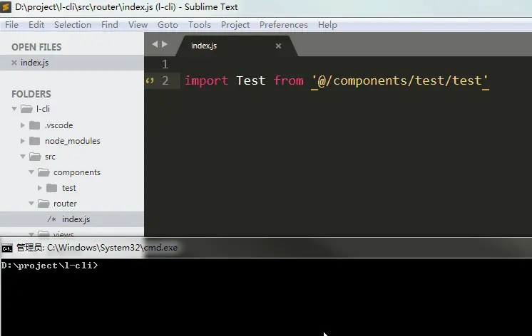 在动图中可以看到,初始状态components下没有任何文件,命令执行后多了test文件夹,同时router中多了一个内容,你们看到稍微有个延时才显示是因为文件内容改变了sublime 提示是否要重新加载,实际创建写入动作很快完成,比重复开头提到的步骤快了nnnnnn倍。
