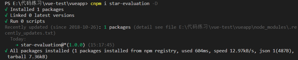依旧老套路,修改版本号-打包-发布,然后我们在练手项目中cnpm i star-evaluation -D再安装一次,因为有时npm update star-evaluation方法不太靠谱,更新不完全。