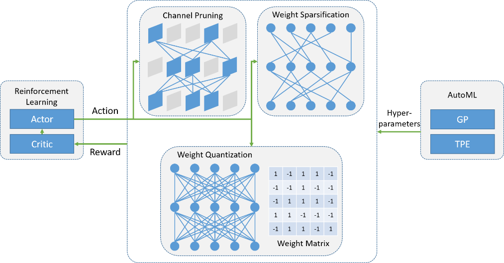 超参数优化(hyper-parameter optimization)部分可以通过强化学习或者AutoML,在整体压缩率一定的情况下,搜索出每一层最合适的压缩比例使得整体的精度最高。多数开发者对模型压缩算法往往了解较少,调节压缩算法参数需要长期的学习和实验才能有所经验, 但超参数取值对最终结果往往有着巨大的影。PocketFlow的超参数优化部分正是帮助开发者解决了这一大痛点,并且通过实验我们发现,其优化结果也要好于专业的模型压缩工程师手工调参的结果。其结构如下图: