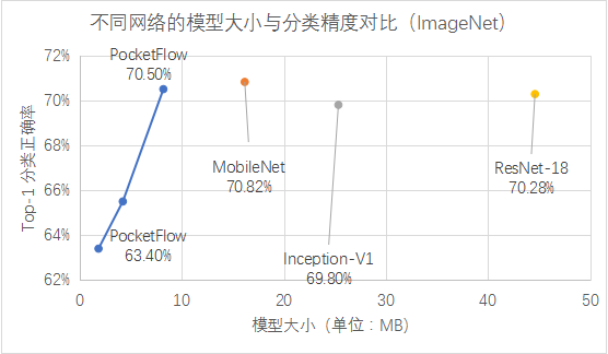 在CIFAR-10数据集上,PocketFlow以ResNet-56作为基准模型进行通道剪枝,并加入了超参数优化和网络蒸馏等训练策略,实现了2.5倍加速下分类精度损失0.4%,3.3倍加速下精度损失0.7%,且显著优于未压缩的ResNet-44模型; 在ImageNet数据集上,PocketFlow可以对原本已经十分精简的MobileNet模型继续进行权重稀疏化,以更小的模型尺寸取得相似的分类精度;与Inception-V1、ResNet-18等模型相比,模型大小仅为后者的约20~40%,但分类精度基本一致(甚至更高)。