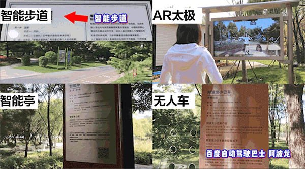 百度与海淀区政府合作,利用 AI 技术把海淀公园改造为全球首个 AI 公园,在这里你可以乘坐阿波龙无人驾驶小巴车,体验智能休息亭、AR 太极等。