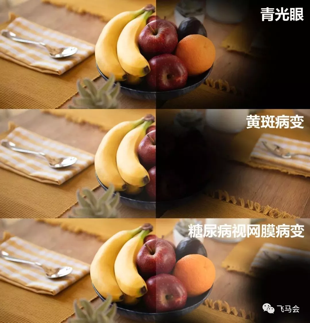 下面这些图片,就是一个双眼健康的人和这三类眼疾病患看相同事物时第一视野的对比图。