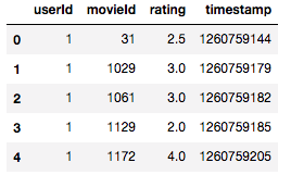 我们来看看数据。 我们将使用userId (类别), movieId (类别)和rating(因变量)进行建模。