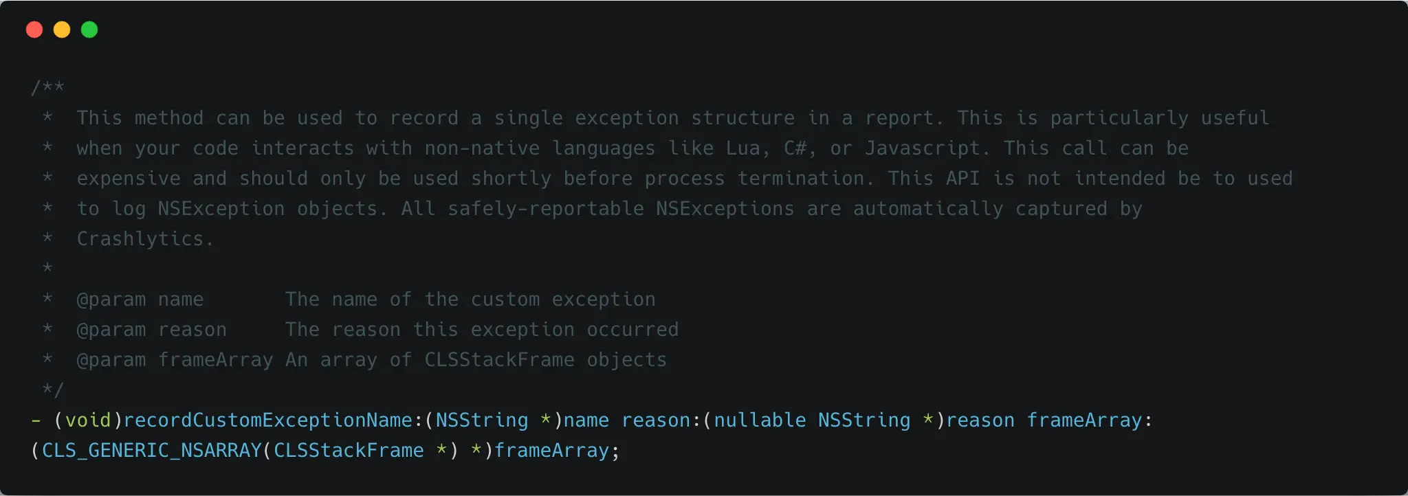 在浏览了 fabric 的各项 API 后,我发现有一个很讨好的接口,recordCustomExceptionName