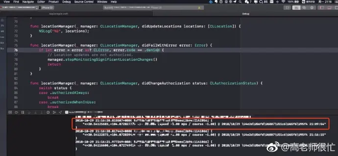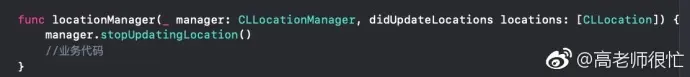 搜索了网上关于 iOS 定位的文章,很多在 locationManager(_:didUpdateLocations:) 收到回调就执行了 stopUpdatingLocation(),如下图:
