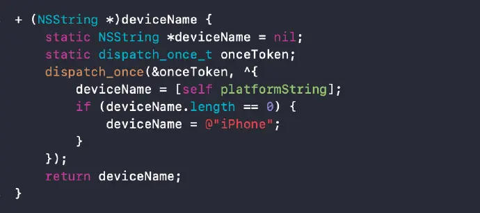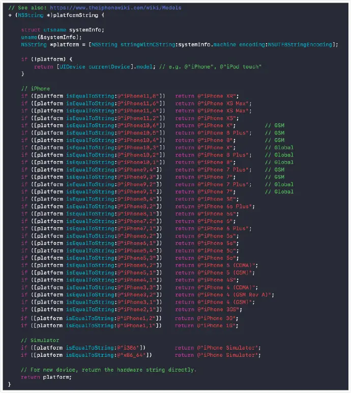 不过,每一种 iOS 设备型号都有对应的一个或多个硬件编码/标识符,称为 device model 或者叫 machine name,之前的小集介绍过,我们可以通过如下图中的代码来获取。