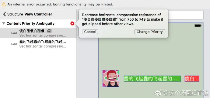 提示说,降低红色 label 的水平方向压缩阻力(即容易被压缩)以确保在其他视图之前可以被裁剪。点击 Change Priority,改变约束优先级。