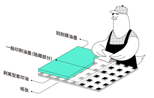 利用特殊油墨印刷的部分,可以用硬币等物品刮下,藉此显示下方印纹。刮刮膜印刷以银色最为常见,也有金色或铜色。为了保证隐蔽性必须考虑底色和刮刮膜配色,避免透光。