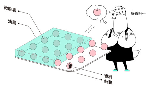 将内涵香料的微胶囊混入油墨印刷的方式,香味除了果香、花香、食物香气等等还可以指定特殊气味。可以选择香气鲜明持久的丝网印刷或节省成本的平板印刷。用的时候记得确保印刷面积足够,并且考量香味和印纹的加成效果。
