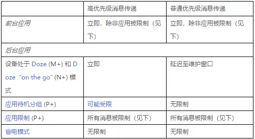★ 注意: 自 2019 年 1 月起,应用限制 (在电池设置里) 将包括对 FCM 消息的限制。可通过 isBackgroundRestricted API 检查应用是否处于受限状态。如果应用处于受限状态,FCM 消息则根本不会被传递至应用。这对高优先级和普通优先级 FCM 消息均适用,且无论应用处于前台还是后台。