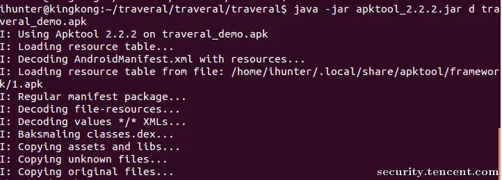 原理:Apktool在解析apktool.yml文件中的unknownFiles字段时,没有对”../“字符串进行过滤,导路径穿越漏洞。